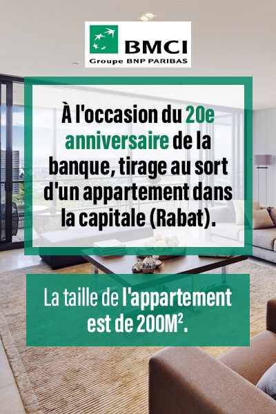 🎉 BMCI fête ses 20 ans – et vous invite à vivre un moment unique qui peut changer votre vie. Depuis deux décennies, BMCI accompagne des millions de Marocains avec des solutions bancaires innovantes, transparentes et sécurisées. Aujourd’hui, pour célébrer cet anniversaire historique, nous souhaitons vous remercier de la manière la plus exceptionnelle qui soit. 🏡 À gagner : un appartement moderne de 200 m² au cœur de Rabat. Un bien rare, une opportunité unique… et votre nom pourrait être celui du gagnant.